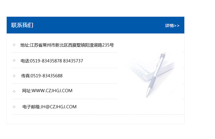 地址:常州市新北區友邦商務大廈1幢16、17層  電話:0519-85101652  傳真:0519-85112595  郵編:213022  網址:www_cz-jiayue_cn.mshdb.com  郵箱:xiajifengaa@163.com